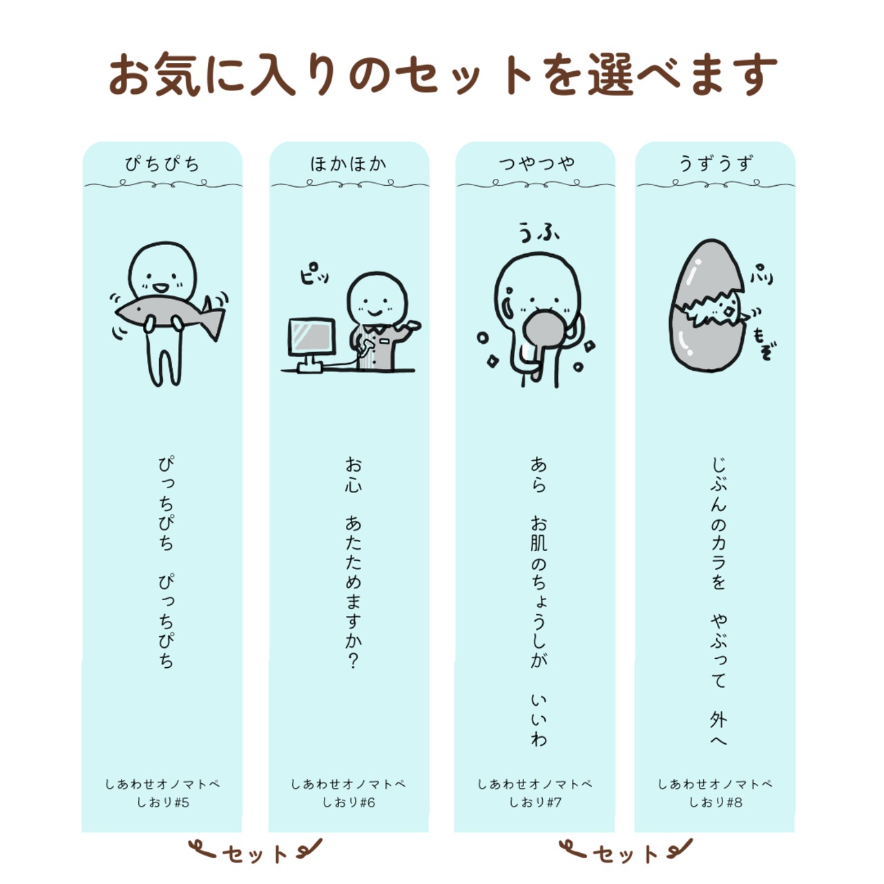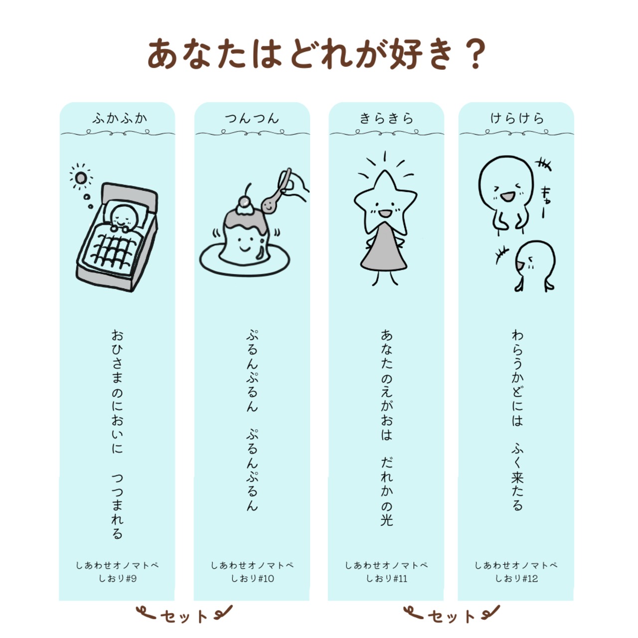 しあわせ気分のオノマトペを描きとめた、水色のしおりです。